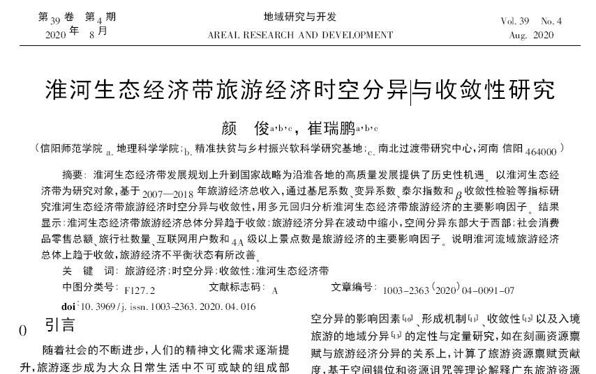 关键词:旅游经济;时空分异;收敛性;淮河生态经济带