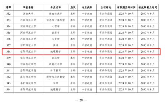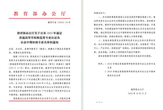 近日,根据教育部办公厅发布的《2024年通过普通高等学校师范类专业认证及认证中期审核专业名单的通知》(教师厅函〔2024〕20号),我院地理科学专业通过了中学教育第二级认证,认证结论有效期六年(2024年10月-2030年9月)。
