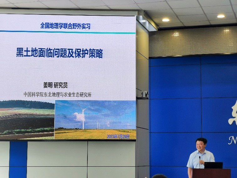 开幕式结束后,由全国大学生地理学野外联合实践教学高等联盟秘书长、华东师范大学周立旻教授主持学术报告。中国科学院东北地理与生态研究所所长姜明研究员作了题为“黑土地面临问题及保护策略”的报告,详细介绍了黑土、黑土地、黑土区的定义与内涵,接着从东北黑土垦殖历史过程出发,指出东北黑土目前面临的“薄、瘦、硬”的问题,介绍了团队的最新研究成果,主要包括初步构建天地空一体化监测、揭示了黑土地力下降的有关机理、发布《东北黑土地保护与利用报告》等,最后提出了“地理学要支持农业发展”的观点。