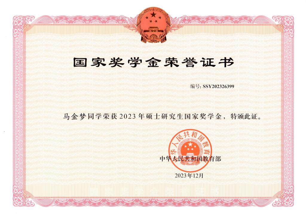 研究生国家奖学金由中央财政出资设立,每年评审一次,用于奖励表现优异的全日制研究生,奖励标准为每生每年2万元。国家奖学金是当前高等学校学生能够获得的荣誉等级最高的奖项,其评审最为规范,标准最为严格,获奖比例仅为0.2%。我院学子再次获得国家奖学金,既是对学生本人学习成果的肯定,也是对学院人才培养效果的综合检验。