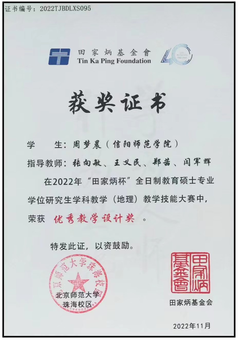本次大赛由“田家炳杯”全日制教育硕士专业学位研究生教学技能大赛专家委员会、学科教学(地理)专家组组织,由北京师范大学主办、北京师范大学珠海校区承办,是高等教育质量监测国家数据平台认定的唯一一项国家级教育硕士教学技能竞赛。比赛4月初启动,分为初赛和决赛两个环节,初赛环节吸引了全国57所高校共207名选手参加。经过初赛评审,共有104位同学进入决赛。决赛采取腾讯会议平台进行,选手进行15分钟现场直播授课和5分钟专家提问。决赛中,周梦晨同学沉着镇定,凭借良好的素质和教育教学技能,出色完成现场授课和专家提问回答环节,喜获“优秀教学设计奖”。