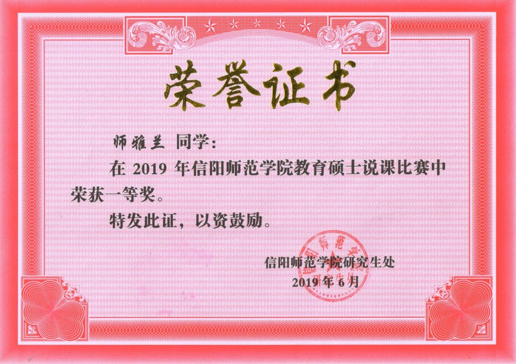 此次说课比赛由信阳师范学院研究生处主办,分为各教学单位选拔与学校决赛两个阶段。在学院举行的选拔赛中,邵美玲和师雅兰同学脱颖而出,与来自全校其他学院推荐的17名研究生一起参加了最后的角逐。在决赛阶段,两位研究生赛前精心准备、沉着应战,从说教材、说学生、说教学过程、说教学方法入手,全面阐述说课内容,表现了较好的驾驭教材、教学设计的能力和良好的语言表达能力,充分展示了我院研究生良好的教学技能。无论是教态、内容设计、重难点把握还是教学方法、多媒体等,都获得了现场评委老师及观众的一致认可。经过激烈角逐,师雅兰和邵美玲分别荣获第三名和第五名。