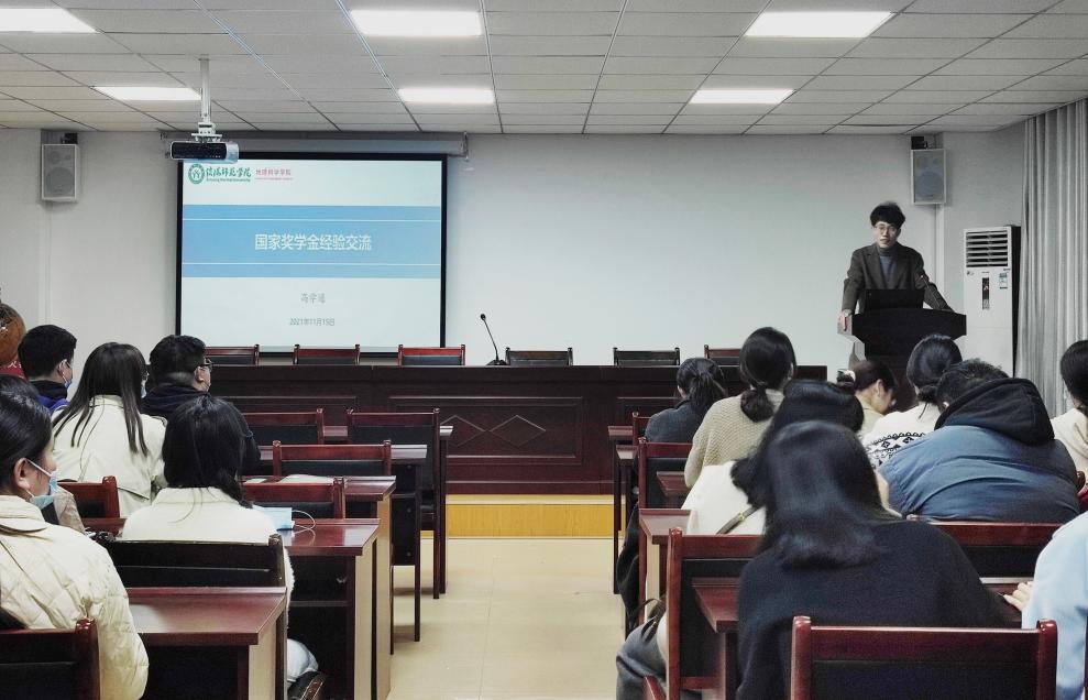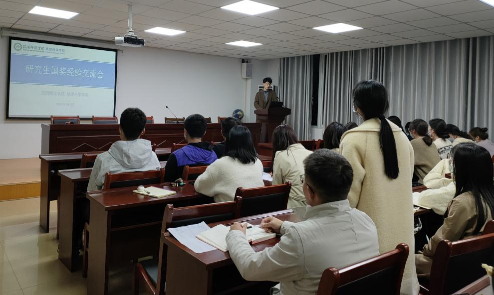 为充分发挥榜样示范和引领作用,11月15日,我院于理科楼南楼410会议室举行硕士研究生国家奖学金经验交流会。学院邀请2021年国家奖学金获得者高学通分享申报国奖的经验,2021级地理学、学科教学(地理)专业30余人参加了交流会,会议由研究生会副主席孙博主持。