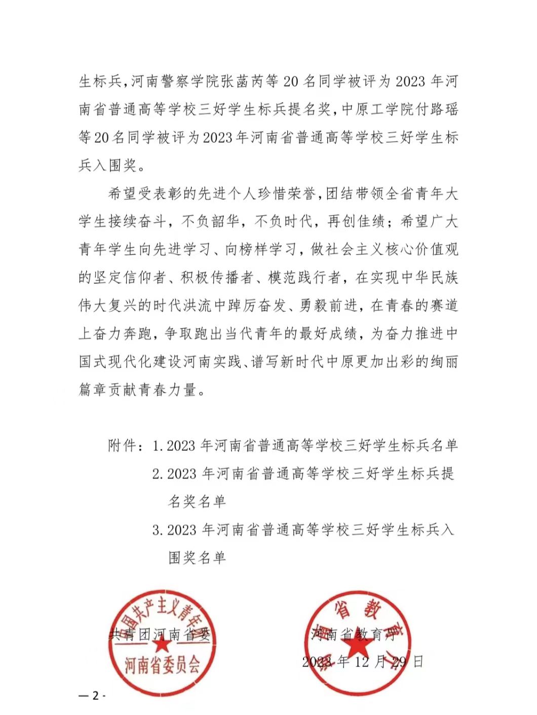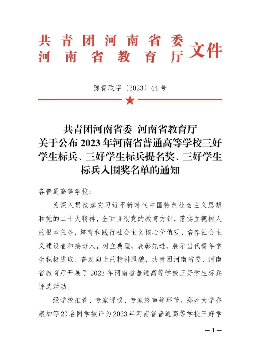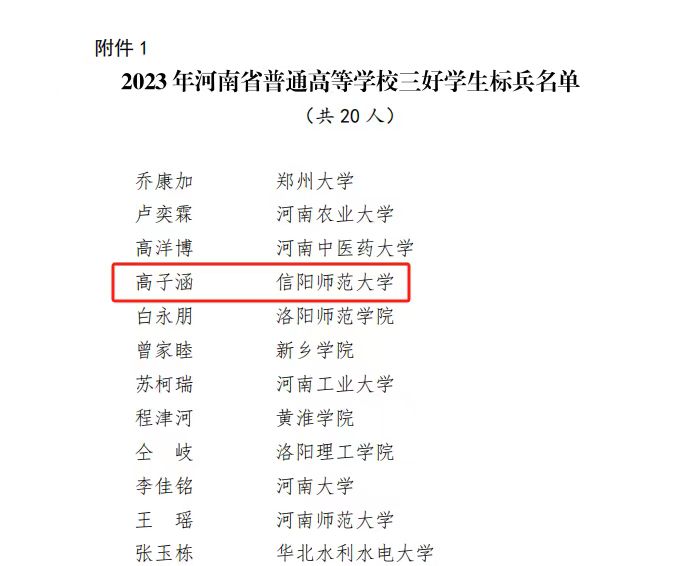 近日,共青团河南省委、河南省教育厅印发《关于公布2023年河南省普通高等学校三好学生标兵、三好学生标兵提名奖、三好学生标兵入围奖名单的通知》,全省共评选出三好学生标兵20人、三好学生标兵提名奖20人、三好学生标兵入围奖20人。我院2020级地理信息科学班高子涵同学荣获“河南省三好学生标兵”荣誉称号。