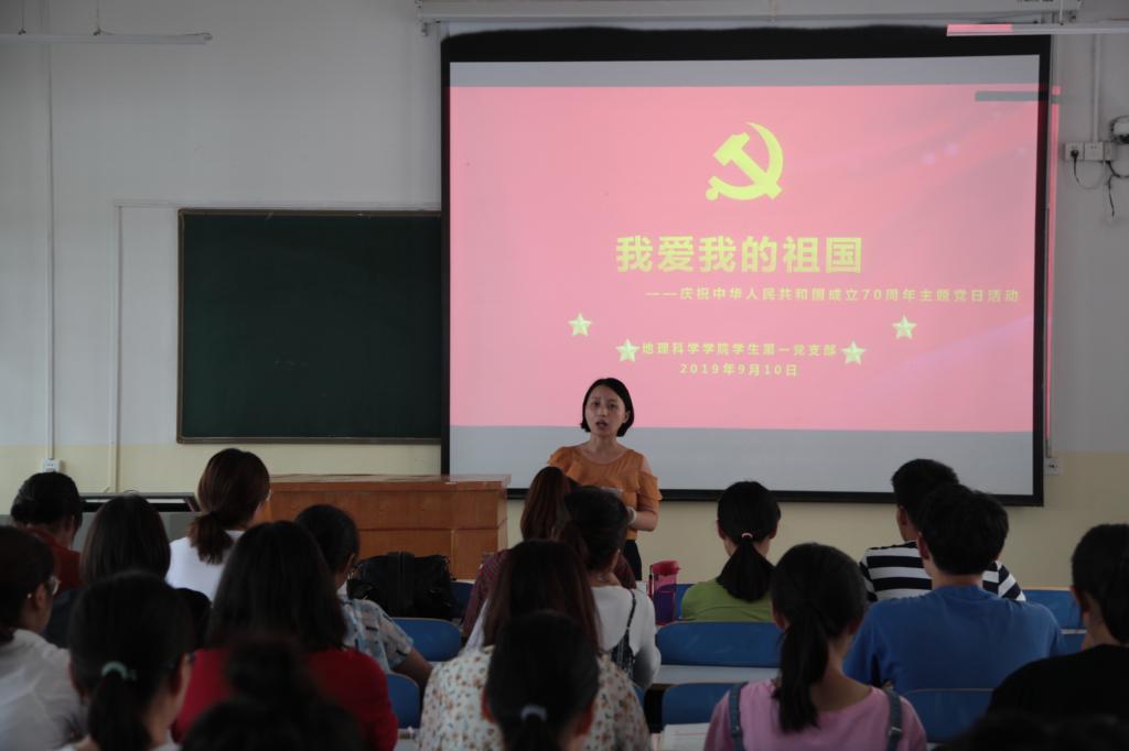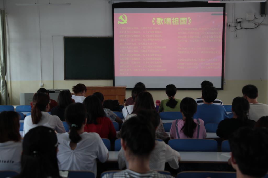 活动伊始,艾甜甜带领参会人员一同回顾中国共产党带领中华民族创立新中国的艰辛历程,并观看了《庆祝新中国成立70周年首次联合演练》视频。随后,全体人员合唱《歌唱祖国》,借此将自己的爱国情怀融入到高昂的旋律中。接着,党支部各小组成员代表依次上台发言,分享个人心得体会。活动最后,艾甜甜对本次活动进行总结,她要求大学生党员要坚持中国共产党的领导,加强自身建设,明确自身责任,自觉融入到实现中华民族伟大复兴的奋斗之中,为国家的发展、进步添砖加瓦。