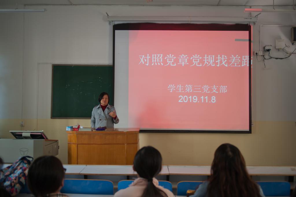 会议伊始,杨辉首先对本次会议作出简要介绍,对大家的言行提出要求,随后,支部党员开展对照反思,重点对照党章,从理论学习、思想态度等方面查找不足。其中,王前同志从政治理论学习的积极性和对习近平新时代中国特色社会主义思想学习的深入性两方面存在的问题进行分析报告,表明自己在今后会加强理论学习,严格要求自己,使自己一言一行做到符合党章的规范。李含同志从遵纪、维护团结、基层调研等五个方面分析自己存在的问题,并对其作出相应的整改措施。党支部其他成员依次对自己存在的不足以及相应的整改措施做出分析报告。最后,杨辉老师对会议做出总结,她以王守仁的名言“人不贵于无过,而贵于能改过”激励大家正视自己的缺点,自觉遵守党章、贯彻党章、维护党章,严守党的政治纪律和政治规矩。
