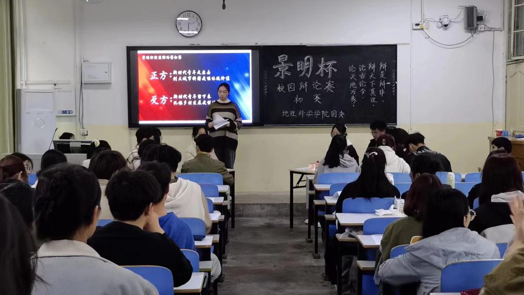 为丰富大学生的课余活动,培养同学们的思辩能力和语言表达能力,4月2日,我院于教三01举办景明杯校园辩论赛初赛。各参赛团队以及我院学生代表积极参加,学生会主席张柯磊、团委副书记刘艺等人担任评委,辩论赛由李雨珂主持。