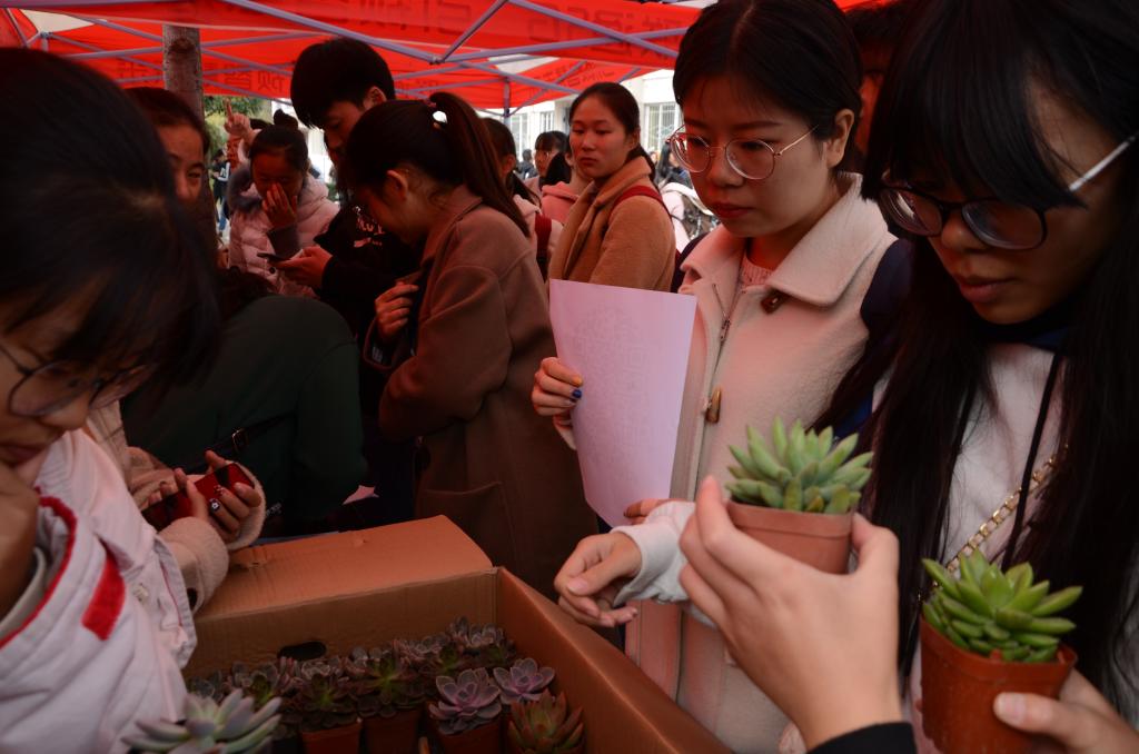 活动尚未开始,已有大批参与者排队等待,路过的同学也被该活动吸引,纷纷驻足,加入长队等待领取一抹绿色。活动过程中,工作人员将准备好的盆栽按类别摆好,并为同学们详细介绍活动流程和注意事项。同学们积极响应低碳环保理念,拿着收集已久的纸箱、塑料瓶进行换购,可爱的多肉植物和小礼品也激起了在场同学们的兴趣,大家纷纷细心挑选,拍照留恋。此次活动主要是通过以物换花、以旧换绿的方式让同学们了解到废旧物品的价值,增强学生收集可再生垃圾的意识,做到低碳环保,追求时尚新生活。
