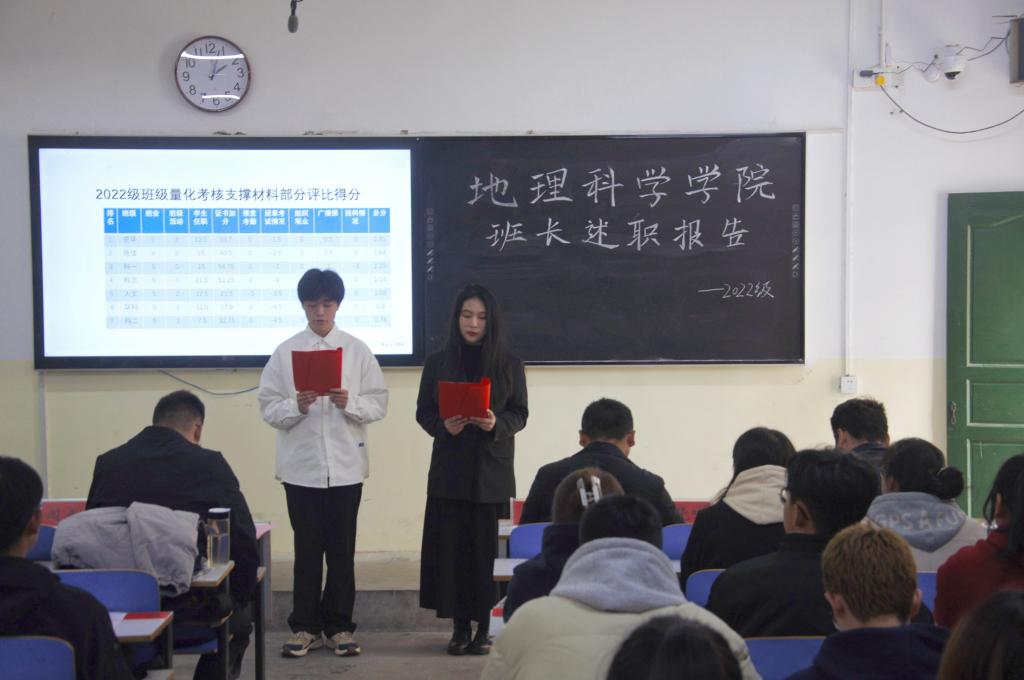 会议伊始,主持人介绍会议出席人员概况和本次班级量化考核的具体内容。接着,曹鹏鹏老师进行发言,他首先表示对大家工作的认可,接着指出班级管理的困难之处并激励各班班委迎难而上再接再厉。其次,各班班长依次上台进行述职,他们以详实的数据与成果就班级成员、班级荣誉、班级建设及对未来的展望等方面进行述职报告,对班级的各项工作进行回顾和剖析,客观地总结了班级工作取得的成效,实事求是地分析了工作中的不足,并针对性地提出解决方案,制定下学期工作计划展望班级美好未来。接着由纪检部王磊颁布2022级班级量化考核支撑材料部分评比得分,并详细介绍分数的赏罚原因 ,加上班长述职得分,最终2022级自然地理与资源环境班获得第一名,2022级地理信息科学班获得第二名,2022级地理科学三班获得第三名,由刘晓咏老师为以上获奖班级颁奖。会议最后,刘晓咏老师发言,在对各班工作表示肯定的同时也激励各班班委不要气馁、不要骄傲,继续砥砺前行,同时也表达了对全体学生大学生活的美好祝愿。