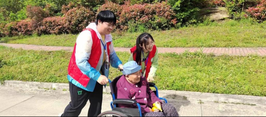 台下的老人们认真观看了表演,纷纷为社员们的精彩表现喝彩。表演过后,社员们给老人们分发水果,与老人们一起散步、聊天,用心陪伴老人们。临别之际,老人们感受到了温暖的关怀,对社员们依依不舍。