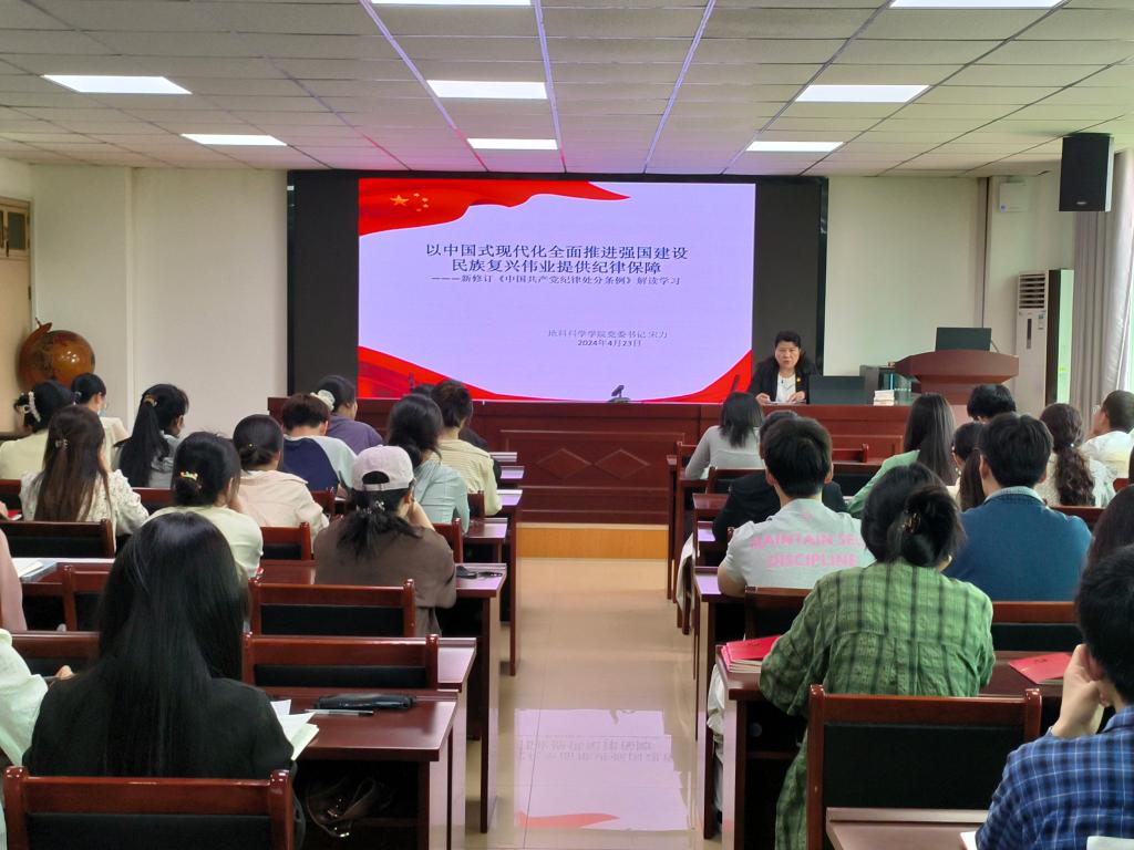 为深入学习贯彻习近平总书记关于党纪学习教育的重要讲话、重要指示精神,我院党委书记宋力以“以中国式现代化全面推进强国建设民族复兴伟业提供坚强纪律保障”为题,在理科楼南楼410为我院全体党员讲授专题党课,旨在确保每位党员都能加深对《中国共产党纪律处分条例》(以下简称《条例》)的精神实质和具体要求的学习和理解。