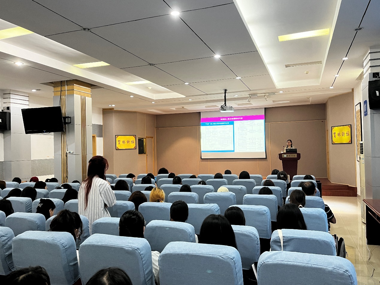 报告会上,李小妹教授从地理学的概念引入,结合多部地理学经典论著,探讨了地理学思想方法在统摄中学地理教学内容的重要性,提出地理核心概念中的六大地理问题。随后,李教授以地理核心素养中的区域认知为例,结合高考真题,详细解读了地理核心素养的定义与溯源,并详细解读了地理跨学科主题学习的内涵及实施路径。报告结束,李教授和与会师生进行了精彩互动,现场气氛热烈。副院长王义民对李小妹教授带来的精彩报告表示感谢。王院长指出,李教授的报告理论性强,高屋建瓴、深入浅出。报告突出了应用性,为地理教学提供了可操作的路径和实用方法,在场师生均受益匪浅。