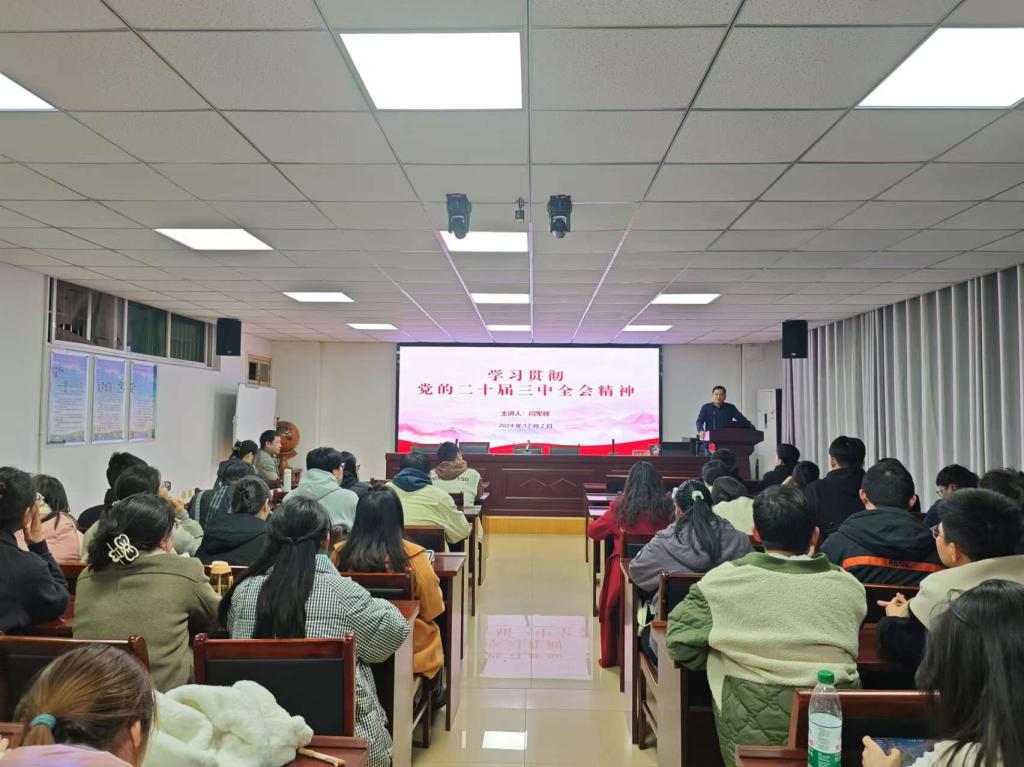 为深入巩固学习习近平新时代中国特色社会主义思想,强化师生政治理论素养,2024年12月2日,WilliamHILL中国党委组织委员、副院长闫军辉于理科楼南楼410会议室作“学习贯彻党的二十届三中全会精神”专题党课,我院研究生80余人参加了学习。