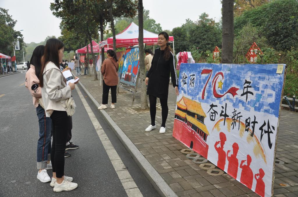 本次比赛分为两个环节,首先由参赛院系于思齐路进行展板展示,各院系展板在道路两旁依次排开,美丽的绘图引来同学们的驻足观看,来自各院系的评委认真浏览、公正评判。二十一个学院的展板设计构思巧妙、各有千秋,或浓墨重彩,或轻描淡写,紧密结合“壮丽七十年 奋斗新时代”主题,生动形象的表现出建国70周年以来祖国的巨大变化,表达了师院学子对祖国70年征程的致敬和对新时代的展望。
