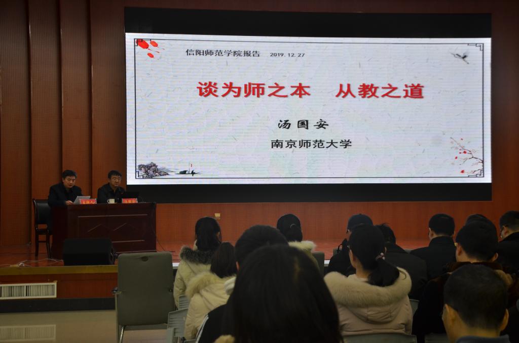 12月27日,应信阳师范学院邀请,南京师范大学汤国安教授于信阳师范学院逸夫楼报告厅作题为“谈为师之本、从教之道”的主题报告,学校五百余名师生到场聆听。报告会由副校长余本海主持。
