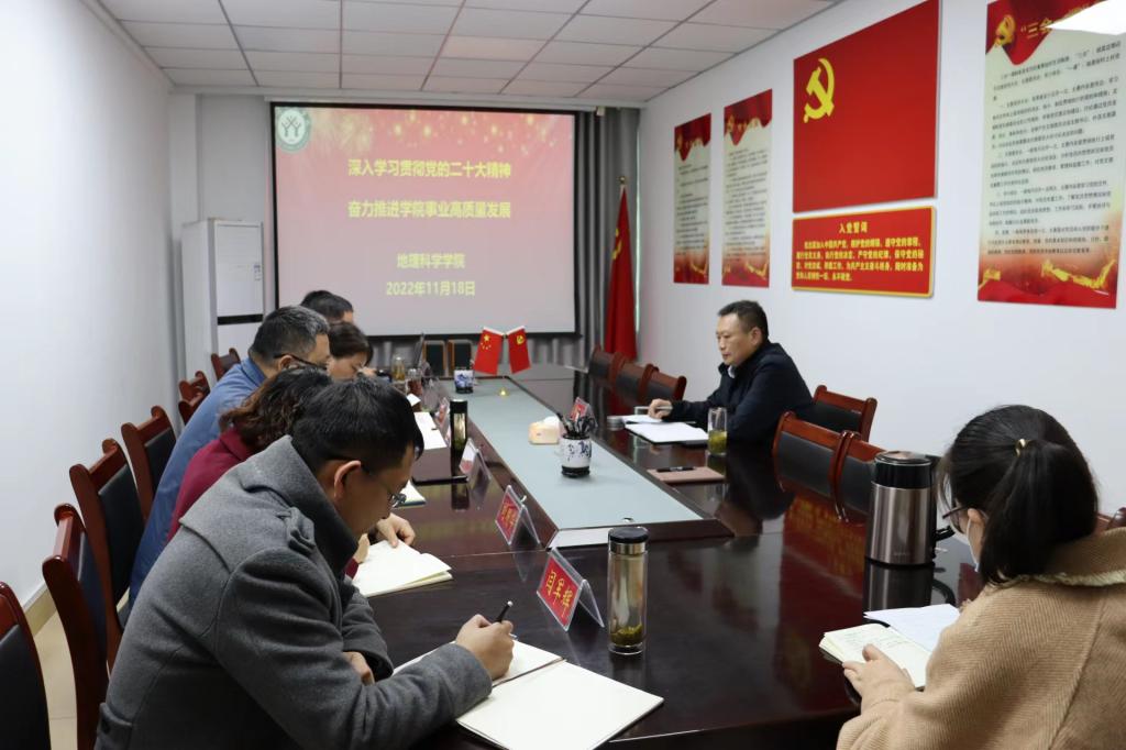 11月18日下午,我院党委理论学习中心组于理科楼南403会议室集中学习研讨党的二十大精神,副校长井强山莅临指导。我院党委理论学习中心组成员参会,会议由我院党委书记宋力主持。