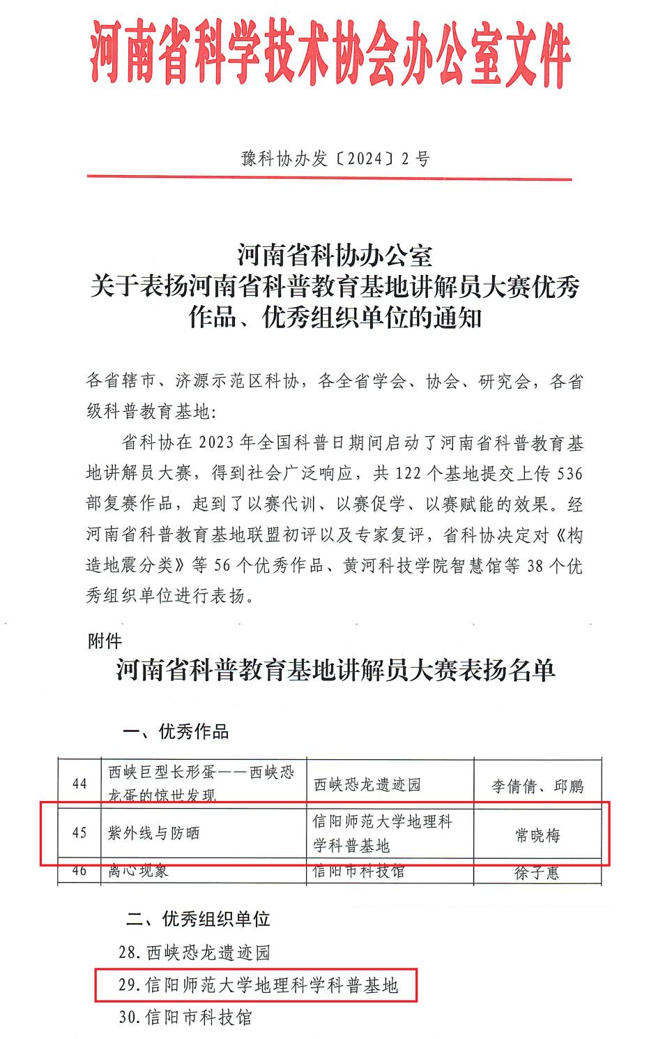 自省科协启动河南省科普教育基地讲解员大赛以来,地理科学科普基地广泛宣传、积极响应、精心筹备,共提交24件作品。经过激烈角逐,常晓梅同学提交的《紫外线与防晒》,从全省122个基地提交上传的536部复赛作品中脱颖而出,荣获优秀作品表彰,地理科学科普基地同时荣获优秀组织单位表彰。
