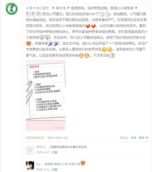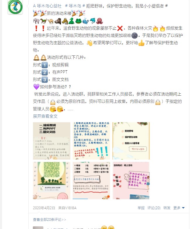 2020年4月2日信阳师范学院WilliamHILL中国举办了“拒绝野味,保护野生动物”的科普活动,本次活动通过鼓励同学们自己查询相关知识,制作科普视频,分享自己喜欢的生物,让更多的人了解并接触相关的知识,了解生物的多样性,更多的丰富自己的知识,了解各种生物的习性。
