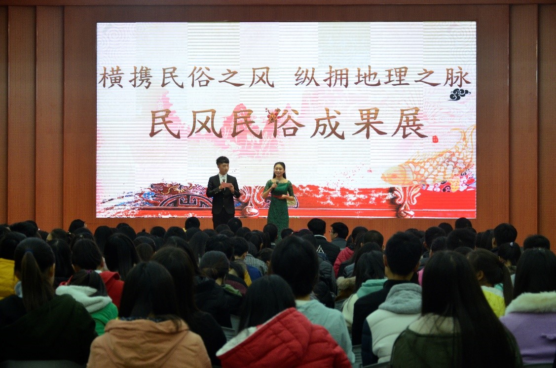 活动伊始,由文学院蔡老师为现场观众做了一个题为“非物质文化遗产保护与传承”的讲座,使同学们对非物质文化遗产的特点和保护现状有了大致的了解,为民风民俗成果的展出做了重要铺垫。随后,由天文地理爱好者协会会长高将对此次民风民俗活动做总结,他首先向对本次活动的举办给予大力支持的领导老师及兄弟社团表示真挚的感谢,他强调本次活动的成功举办对普及民风民俗知识,弘扬传统文化具有重要意义。紧接着是极具地区特色的文艺表演,来自各少数民族的表演者为现场观众带来了一场民风民俗的视听盛宴。其中,美丽的哈萨克族女孩儿王雨桐凭借着动人的歌喉用一首《纳西篝火啊哩哩》将西南地区浓郁而独特的音乐风格表现的淋漓尽致不仅欢快活泼,赢得场下观众如潮般的掌声。两位维吾尔族同学带来的民族舞蹈更是将全场气氛推向高潮。接下是激动人心的颁奖环节,主持人宣布获奖名单,由现场领导老师分别为获得一二三等奖的同学颁奖。最后,由社团指导老师林昊对此次活动做总结发言,他指出,此次活动不仅是场比赛,更是一场文化盛宴,非物质文化遗产在这个物欲横流的时代已经在快速流失,此次活动的举办对保护非物质文化遗产具有重要意义。