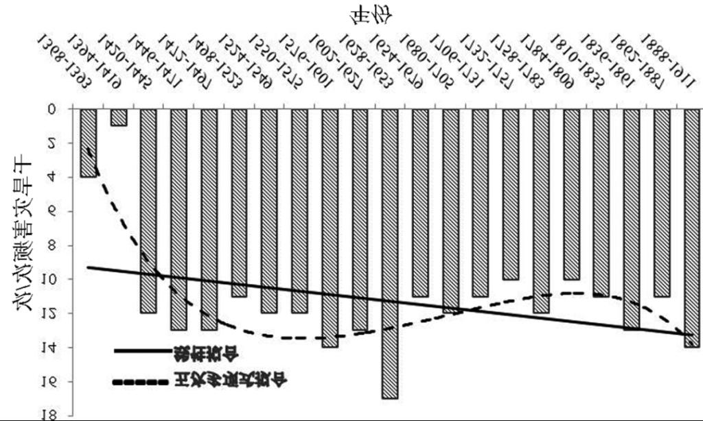 明清小冰期与干旱灾害发生时间变化具有对应性。17世纪是最寒冷的时期,对应干旱灾害发生最为频繁,据统计17世纪河南省共有54a发生干旱灾害。相当于每两年发生一次,万历43年至天启元年发生了6a连旱,崇祯6年至崇祯16年发生了11a连旱,而崇祯末年的大旱持续时间较长。由以上可知,明清气候寒冷时期干旱灾害频发,气候温暖时期干旱灾害频次减少。