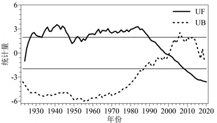 图2 1923-2020年北京市年日照时数Mann-Kendall突变分析