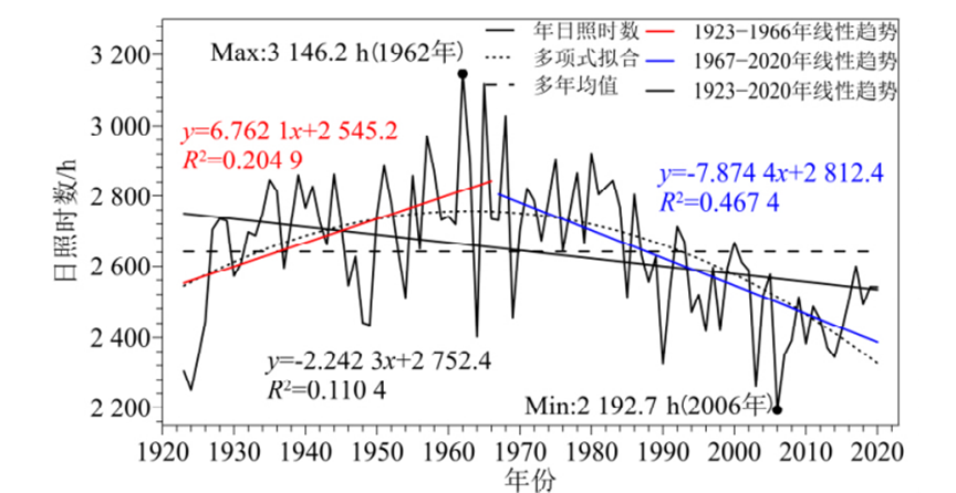 首先,研究者根据数据发现1923-2020年北京市年日照时数呈显著减少趋势,变化速率为(-22.42±12.89)h/10a;夏、秋和冬季日照时数均呈减少趋势,夏季减少幅度最大,减少速率为(-12.18±5.38)h/10a;秋季、冬季次之,减少速率分别为(-9.97±4.25)h/10a和(-4.50±4.16)h/10a;春季日照时数则以(4.19±5.31)h/10a的速率呈不显著增加趋势。