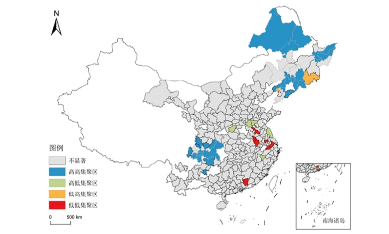 进一步运用空间自相关分析方法探测流动人口离婚率的空间集聚特征,借助Local Moran'I指(局部莫兰指数,用于识别空间冷热点)计算得到流动人口离婚率的LISA(局部空间关联指示图)集聚图,流动人口离婚率呈现出明显的空间集聚特征。