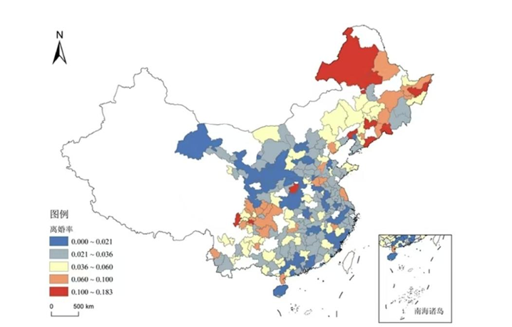 由于不同地区发展历史、人口结构和文化特质等地理差异,区域间的流动人口离婚率呈现出明显的空间分异特征,流动人口离婚率呈现出自东南向西北的低高低的特征。