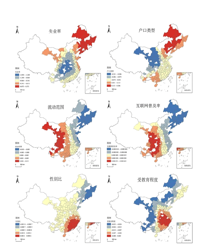 研究者还探讨了流动人口离婚率影响因素的空间异质性特征,结果表明,失业率对流动人口离婚率的负向影响呈现出从中部地区向周边递减的特征,户口类型对流动人口离婚率的正向影响集中在东北地区,负向影响集中在西部地区,互联网普及程度对流动人口离婚率的正向影响集中在西部地区,性别比对流动人口离婚率的负向影响呈现出从东北地区向周边地区递减的特征,受教育程度对流动人口离婚率的负向影响集中在西部地区。