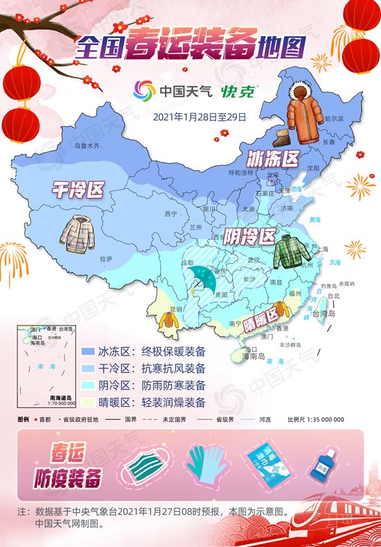今天(1月28日)开始,2021年春运的大幕正式拉开。然而,今年春运一开场,便撞上了一股“实力不俗”的冷空气,受其影响,我国中东部多地将出现4~8℃降温,东北部分地区降温或超10℃。尤其在今年疫情防控的背景下,回家路上的你都需要些什么装备“护体”呢?如何能在人群密集的春运大潮中做好个人防护?中国天气网、快克感冒药联合推出全国春运装备地图,助你安全回家!