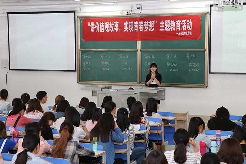 信阳师范学院以班级为单位,围绕社会主义核心价值观12个主题词,组织大学生创作价值观故事,课上讲、课前讲,课外讲。