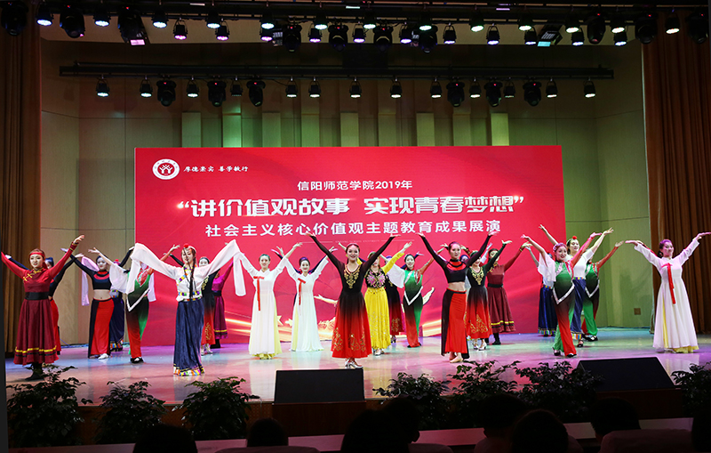 2019年6月4日,信阳师范学院举办2019年“讲价值观故事、实现青春梦想”社会主义核心价值观主题教育成果展演,把讲故事与多种文艺表演形式相结合,运用视频展播、故事讲述、音乐表演和优美的舞蹈、舞台剧等艺术形式,让核心价值观故事入眼入耳、入脑入心。