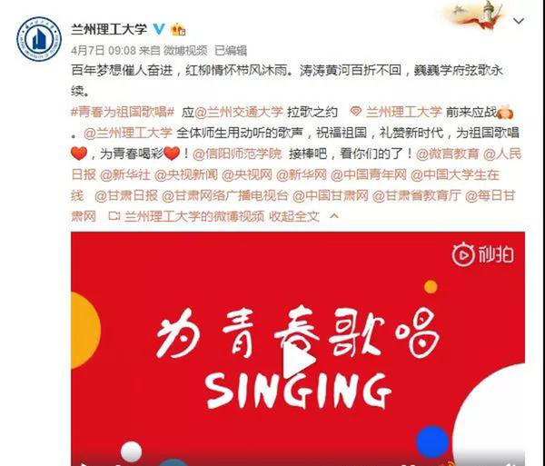 4月11日,信阳师范学院应甘肃兄弟院校的邀请,在学校新媒体上率先开启河南省高校拉歌活动的第一棒,号召青年学子们献歌“五四”百年和新中国70周年华诞,展现新时代青年风采。