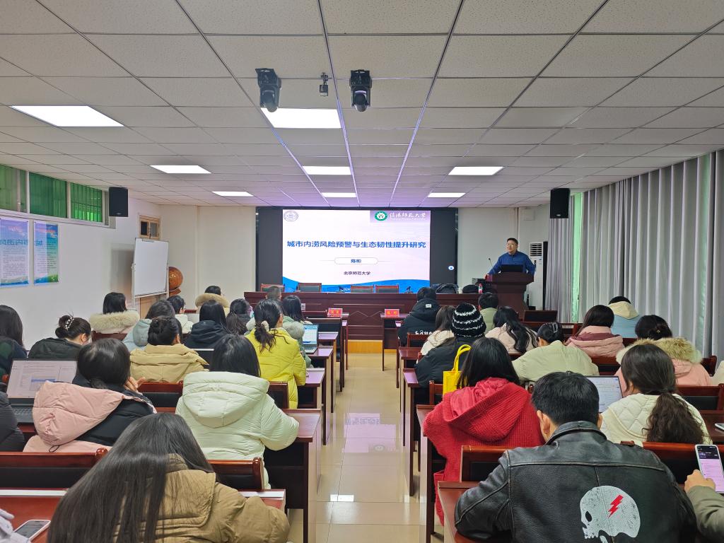报告会上,陈教授首先以党的二十大报告及2022年版《国际城市蓝皮书》为出发点,通过国内外城市内涝典型案例介绍了城市内涝灾害风险现状,指出了包含自然因素、城市建设因素、城市管理因素的城市内涝致灾机理,阐述了城市内涝风险管理前沿问题及技术瓶颈。然后,陈彬教授深入讲解了通过物理感知和社会感知构建多维感知图谱、以机理+数据驱动进行城市内涝风险模拟,利用Nbs+基础设施协同优化提高城市生态韧性。最后,陈彬教授提出了以数据赋能城市洪涝感知监测和数据赋能城市生态韧性建设的未来展望。颜俊对陈彬教授带来的精彩分享表达诚挚感谢,并期望与会教师和学生在学术研究中能够坚定自己的研究方向,通过实地调研寻找当前急需解决的现实问题,以期实现理论和方法的突破。