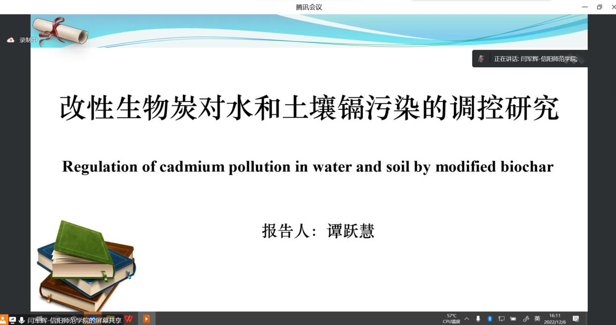 报告会上,谭跃慧博士围绕生物炭对水和土壤中重金属镉的吸附问题,对比分析了猕猴桃枝生物炭和不同改性的猕猴桃枝生物炭对镉的去除效果和机理,并根据柱实验研究了在砂柱中填充生物炭对溶液中镉的过滤去除能力,最后通过盆栽实验进一步探讨了生物炭对土壤中镉的吸附固定作用以及对植物中镉的修复效果。谭老师指出,该研究不仅为利用猕猴桃枝生物炭和改性猕猴桃枝生物炭治理水和土壤中镉污染提供了科学依据,还为生物炭的产业化使用奠定了理论基础。自由讨论环节,谭博士详细解答了师生的问题,并就生物炭的吸附效果和去向进行了热烈讨论,现场气氛活跃。